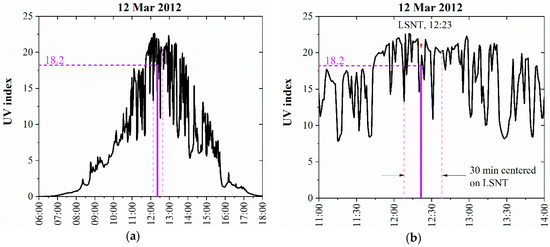 Figure 3. (a) UV index in Quito during 12 March 2012. (b) Detailed UV index from 11:00 to 14:00. The vertical violet solid line indicates the LSNT and the corresponding record.