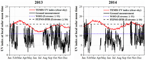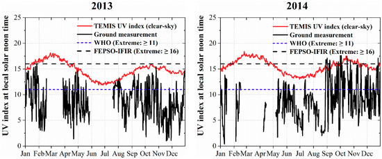To explore the variation, we additionally generated the UVI mean values for 30 min during three consecutive periods, before and after the 30 min period centered on the local solar noontime (Figure 2). For comparison purposes, we considered, as extreme values, both the UVI levels larger or equal to 11.0 (WHO scale) and larger or equal to 16.0 (FEPSO-IFIR scale).