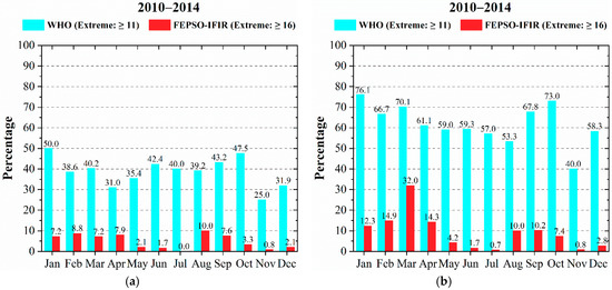 According to the WHO scale, during 2010 to 2014, the percentage of days with extreme UVI values (≥11.0) during 30 min centered on the local solar noontime varied between 25.0% and 50.0% (Figure 7a). Conversely, when using the FEPSO-IFIR scale (≥16.0), this percentage varied between 0.0% and 10.0%. Interestingly, when including the other 30 min periods of Figure 2, the percentage of days with extreme UVI values (≥16.0) increased to 0.7%–32.0% (Figure 7b), with the largest belonging to March (32.0%), and then, February (14.9%), April (14.3%), January (12.3%), September (10.2%), and August (10.0%).