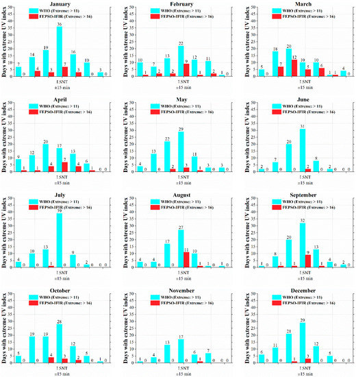 The percentage of days with extreme UVI values, using the WHO scale, varied between 40.0% and 76.1% (Figure 7b). Therefore, for these percentages of days per month, people should avoid excessive solar radiation exposure. This message, according to Zaratti et al. [11], is not appropriate for South America, taking into account the origin and conception of the WHO scale. Using the FEPSO-IFIR scale, people should avoid excessive exposition between 0.7% and 32.0% of the days per month. For UVI of 16.0 and after 30 min of exposition, there will be detectable damage (1 MED) to people with skin type V (South American). However, the exposure time is different for other types [11]: 10–13 min for skin types I and II (Celtic, Pale), 17 min for skin type III (Caucasian), 20 min for skin type IV (Mediterranean), and 63 min for skin type VI (Black).