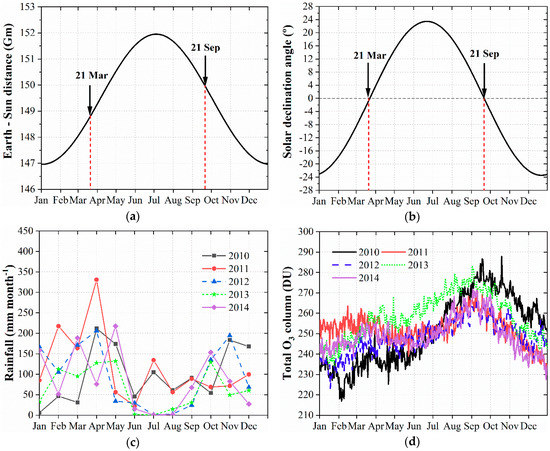 Figure 9. (a) Sun–Earth distance (Gm). (b) Solar declination angle (°). (c) Rainfall (mm month−1) during 2010 to 2014 (Belisario station, Central–Northern Quito). (d) Daily total O3 column (DU) of Quito during 2010 to 2014 [18].
