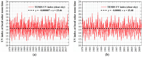 For each day (one file per day) of the period 1979–2018 (40 years, 14,607 days), from the MSR-2 dataset [18], we extracted the UV index at local solar noontime and in clear-sky conditions, for the cell corresponding to the location of the UVI sensor in Quito (column 406, row 360). This information was used to analyze the UVI trend from 1979 to 2018. The linear fit of time (x) versus the daily UV index (y) of 1979–2018 for Quito (Figure 10a) was almost parallel to the x-axis (y = −0.000007 × x + 15.46). The fit of 1979–2009 (y = −0.00001 × x + 15.48) was similar to the fit of 1979–2018. Moreover, the fit (y = −0.00003 × x + 15.42) of 2010–2018 (Figure 10c) showed a slight negative tendency (slope = −0.00003). None of the fits of Figure 10 showed a positive trend. The UV index (local noontime and clear-sky conditions) of 1979–2009 varied between 15.4 ± 3.2, which was similar to the 15.3 ± 3.2, the range of 2010–2018 (Figure 10d).
