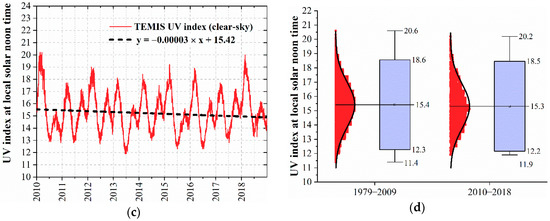 Figure 10. Daily UV index at local solar noontime and in clear-sky conditions for Quito [18]: trend during (a) 1979–2018, (b) 1979–2009, (c) 2010–2018. (d) Statistical distribution, mean, mean ± 2 standard deviations, and maximum/minimum UV index during 1979–2009 and 2010–2018.