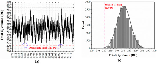 Figure 11. Total O3 column (DU) of Quito [18]: (a) values of the period 1979–2018; (b) statistical distribution.