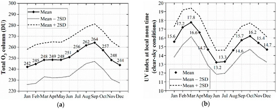 Figure 12. Monthly mean values of Quito, computed for the daily datasets of the period 1979–2018 [18]: (a) total O3 column (DU); (b) UV index at local noon time for clear-sky conditions.