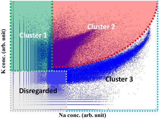 The Na and K peaks in individual mass spectra were integrated, and mass spectra with zero signals for both ions were discarded. This reduced the data set to 9 × 107 mass spectra corresponding to individual aerosol particles with a detectable Na and/or K content. The large size of the data set makes traditional clustering analysis techniques inapplicable, or at least highly impractical, and it was necessary to apply an alternative method. Three data clusters were initially qualitatively identified based on a density-based map of the complete data set indicated in Figure 1. In the next step, the density-based clustering approach, DBSCAN (density-based clustering of applications with noise), was used to extract the desired clusters and normalize them into templates [44,45]. The density-based clustering approach utilizes a local cluster criterion, and clusters are defined as regions in data space where the objects are dense and remain separated from one another by low-density regions [45]. DBSCAN can describe arbitrarily shaped clusters, and the method has been applied to AMS data and compared with the ART-2a (Adaptive Resonance Theory-2a) method [44]. Finally, the boundaries of the three clusters were described by non-linear functions, as illustrated in Figure 1. A fraction with both low Na and K content was also discarded to avoid potential influence of noise in the data (Figure S1). A more detailed analysis of daily data sets shows that Cluster 1 and 3 are consistently described by the clusters indicated in Figure 1. On the other hand, Cluster 2 with both high K and Na content includes several overlapping sub-clusters (examples can be found in Figure S2), which suggests that this factor includes contributions from a group of sources. As described below, Cluster 1 can be associated with residential wood combustion, Cluster 2 with a mixture of other combustion sources, and Cluster 3 with sea spray.