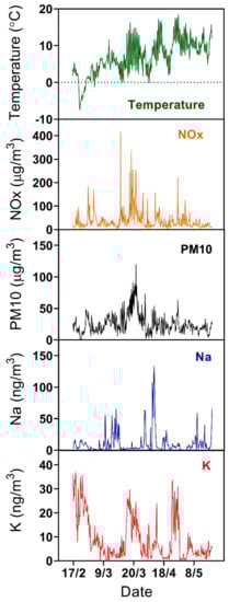 Figure 2 shows an overview of the Na and K concentrations measured during the period from 16 February to 20 May 2007, together with meteorological, PM10, and NOx data [43]. The Na and K concentrations are typically in the range 1–50 ng m−3 and show large variability on the time scale of a few hours for both elements with peak concentrations above 100 ng m−3 for Na. The time series indicate that the two concentrations are correlated during some periods, but this is not generally true and the Na/K ratio usually varies in the range from 0.1 to 20. The alkali concentrations do not appear to show a general trend related to seasonal changes, and the reasons for the observed concentration variability are instead to be sought in the changes in atmospheric conditions and source strengths.
