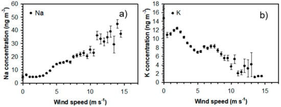(a) Na and (b) K concentrations as a function of wind speed for all data obtained during the measurement campaign. Error bars correspond to ±1 standard deviation.