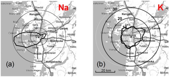 (a) Na and (b) K concentrations as a function of wind direction (Femman station) for all data obtained during the measurement campaign.