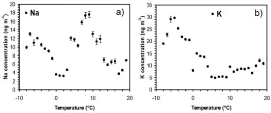 (a) Na and (b) K concentrations as a function of temperature for all data obtained during the measurement campaign. Error bars correspond to ±1 standard deviation.