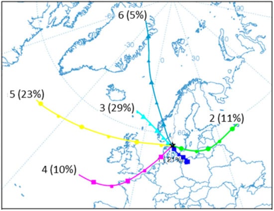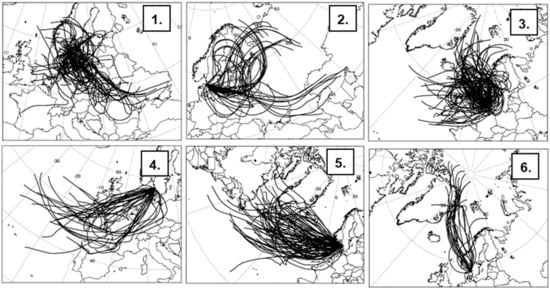To further evaluate the origin of the detected particles, back trajectories of air masses reaching Gothenburg were calculated and analyzed by group analysis. The results from a six-group solution are presented in Figure 6, where the traces for individual back trajectories are indicated. Figure 7 shows the resulting mean trajectories for the six group solutions and the relative contribution to each cluster in percent. Some of the clusters consist of trajectories with a complex pattern, while some were more directed from a certain region. The individual clusters are attributed to different regions of origin for the air masses: Central (C), Eastern (E), Northern (N), and Western Europe (W), as well as clusters with Atlantic (A) and Polar (P) origin.
