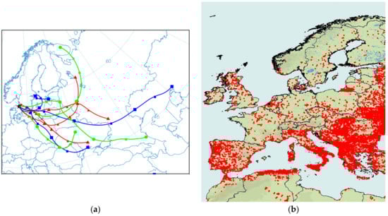 (a) Seventy-two hour backward trajectories for 24 March to 1 April 2007. A new trajectory was started every 12 h. (b) Distribution of fires from the same period. Each dot on the map indicates a fire detected with the moderate resolution imaging spectroradiometer (MODIS) aboard the Terra satellite [58].