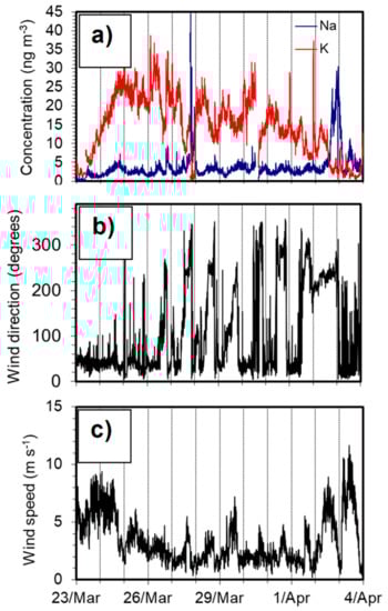 Data from an episode from 24 March to 4 April; the vertical lines indicate midnight: (a) K and Na concentrations, (b) wind direction, and (c) wind speed.