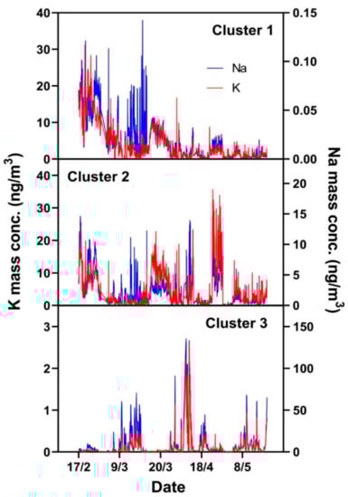 The results in Figure 10 indicate that the concentrations of Na and K are generally correlated, in spite of occasional variations. Cluster 1 has a closer linkage in the winter season, while Cluster 2 has no apparent seasonal trend coupling. This agrees with the temperature dependence of K mass concentrations illustrated in Figure 11a, which shows that low temperatures favor Cluster 1, while Cluster 2 shows no clear dependence on temperature. They are both favored by low wind speeds (Figure 11b).