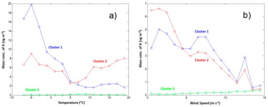 K concentration in Clusters 1, 2, and 3 as a function of (a) temperature and (b) wind speed.