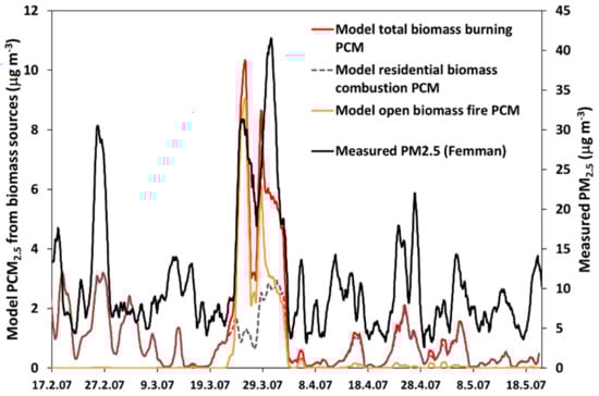 PM2.5 concentrations at the urban background station Femman in Gothenburg (black line, right scale), during the period 17 Feb–20 May 2007 [43], and modeled concentrations of particulate carbonaceous matter (PCM) in PM2.5 from the following: residential biomass combustion (grey, dashed line), open biomass burning fires (including wild fires and agricultural fires, orange line), and total biomass burning PCM (red line). Unit: μg m−3. The data were smoothed using moving 24 h mean concentrations.