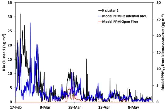 Comparison of the modeled hourly concentrations of primary PM2.5 from residential biomass combustion (BMC, blue line) and open fires (red line) and measured (hourly average) concentrations of K in Cluster 1 (black line). Units, model results: ng m−3; measurements: ng K m−3.