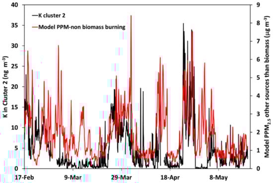 Figure 14 illustrates the modeled concentration of PPM2.5 from fossil fuel combustion and the measured K concentration in Cluster 2. The correlation between the model and measurements is lower for Cluster 2 than for Cluster 1 (see also Table 2; R = 0.61 for 24 h moving average concentrations)—this is not surprising because the model PPM2.5 (from other sources than biomass burning) represents sums of many different sources, including, for example, traffic exhaust emissions, coal combustion, industrial processes, and waste burning. However, several features in the experimental data are qualitatively represented by the model results.