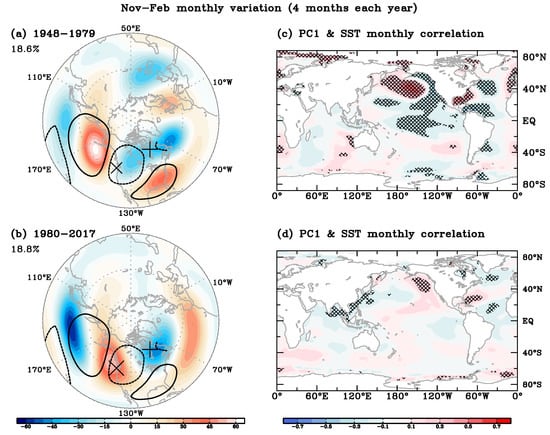 Empirical orthogonal function (EOF) analysis results of (a) 1948–1979 and (b) 1980–2017 with the PNA pattern superimposed and the dipole centers marked with × and + in North America. The correlation map between monthly SST anomalies and the first principle component (PC1) for (c) 1948–1979 and (d) 1980–2017.