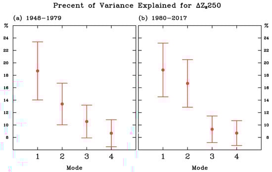 Percent of variance explained for Δ250 during (a) 1948–1979 and (b) 1980–2017. Only the first four modes are presented.