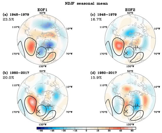 First and second EOF modes of NDJF winter seasonal mean Δ250 for the early period (1948–1979) (a,c) and the late period (1980–2017) (b,d). The Dipole centers (marked with × and +) are superimposed with the PNA pattern (contour) as in Figure 1. The percent of variance each EOF mode explains is listed as well.