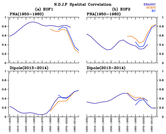 Spatial correlation coefficients between PNA/Dipole pattern and (a) EOF1 (b) EOF2 results. EOF analysis and the spatial correlations are conducted via a five-year sliding-EOF window with three different datasets.