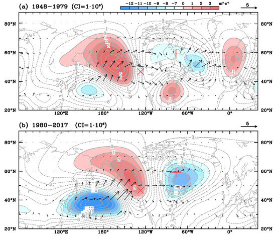 The regressed NDJF monthly 250-hPa Streamfunction (Gray lines for contour; interval (CI) = 1 × 106) during (a) 1948–1979 and (b) 1980–2017. Vectors represent the associated horizontal component of the wave activity flux (m2 s−2).