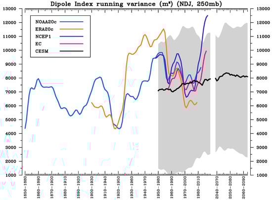 The 30-year running variance of the Dipole index (DPI) derived from Wang et al. (2014) by using multiplied reanalysis datasets. Gray shaded represents CESM 40-member ensemble spread, which represents two standard deviations from the ensemble mean.