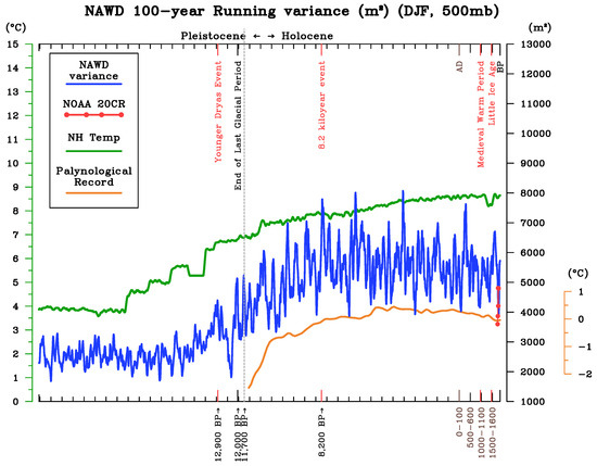 During the last glacial period, North America was characterized by a thick layer of ice covering the area that now constitutes the eastern dipole of the NAWD; this would certainly have affected atmospheric circulation patterns beyond that expected from temperature alone. Large ice sheets remained just to the north of the eastern dipole region of central Canada until between 9000 and 7000 years BP and much of the Holocene vegetation types we are familiar with did not occur until 5000 years BP (Williams et al., 2004) [36]. As such, comparisons of NAWD variability to Northern Hemisphere temperature trends over the period from 5000 years BP until the present likely presents the most robust paleo analog for how temperature may affect NAWD into the future. From 5000 years BP to the present, ice core stable isotopes and palynological studies indicate that temperatures across the Northern Hemisphere have slowly declined, and that NAWD variance has also declined (Figure 7). Overall, reconstructions of paleo temperature and simulations support an interpretation of greater energy and temperatures across the Northern hemisphere promoting greater NAWD variability.