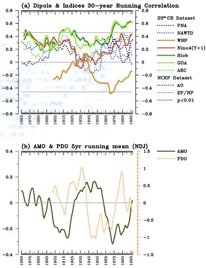 The x-axis presents the middle era for: (a) The 30-year running correlation of the Dipole index and Climate indices. The solid lines represent that the index exceeds the significant level; the dotted lines show the index does not exceed the significant level. Gray lines indicate significant value (p < 0.01). (b) The five-year running average for AMO and PDO index.