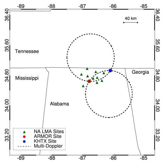 In this section, the lightning and radar instrumentation, datasets and methods are presented. One of the motivations behind this study was to take advantage of the availability of a large sample of storms (Table 1) that have been largely processed, analyzed and presented in prior studies using similar instruments and methods [31,32,56,57]. Although the datasets and methods of this study overlap with prior studies, their scientific objectives are different. One prior study [56] analyzed a single case study for the purpose of relating radar and lightning properties. The other studies analyzed either a few storms in detail [31] or the statistics of a large sample of storms [32] in order to investigate the kinematic and microphysical controls of lightning jumps, which are a nowcasting signature of storm intensity and severity. Nearly all of the storms (i.e., 32 of the 33) analyzed herein were first analyzed in the prior studies [31,32,56,57], highlighting an advantage that the datasets and methods have been well vetted. These studies built upon even earlier work [13,14], which first developed the techniques and pioneered the use of the Alabama radar and lightning networks (Figure 1). This study extends the science of the earlier work [13,14] by utilizing the specific storm datasets and processing methods of the more recent studies [31,32,56,57].