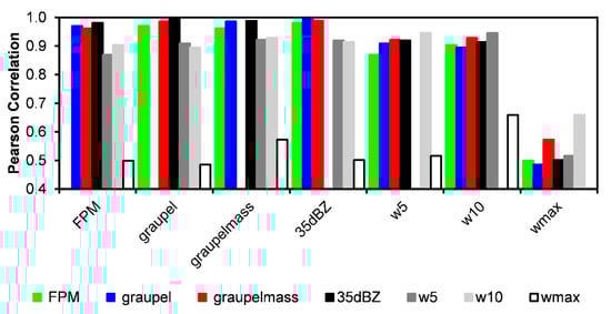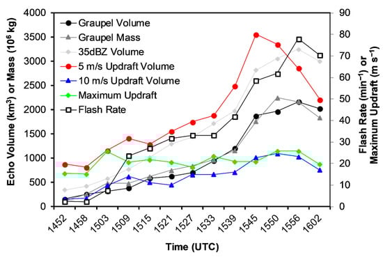 Pearson correlation coefficients (ρ) between the time series evolution of lightning flash rate, kinematic parameters (maximum updraft and convective updraft volume >5 m s−1 and >10 m s−1) and microphysical parameters (graupel volume, graupel mass and 35 dBZ echo volume) are provided in Figure 3. The lightning flash rate is highly correlated to most storm parameters, including especially the microphysical parameters (ρ = 0.96 to 0.98) and, to a slightly lesser extent, the updraft volumes (ρ = 0.87 to 0.90). Flash rate is least correlated to the maximum updraft (ρ = 0.50) in this particular severe storm. These correlations between flash rate and radar kinematic and microphysical parameters are generally similar to what has been found in prior studies of individual storms [8,9] and small samples of storms from similar regions [13,14,48]. The correlation between maximum flash rate and maximum updraft in this storm is lower than found in one study [13] but agrees more closely with other radar [48] and numerical cloud modeling [11,47] studies. It is worth noting that most kinematic (other than maximum updraft) and microphysical parameters are also well correlated to each other (ρ = 0.89 to 0.99), as noted in an earlier study [14]. As expected, the radar parameter with the highest correlation to maximum updraft is the updraft volume > 10 m s−1 and the second highest is to updraft volume >5 m s−1, although all storm parameter correlations with maximum updraft are ≤0.66. The moderate-to-high correlations of most radar kinematic and microphysical parameters with each other and with flash rate in Figure 3 suggest that there should be little difference in the expected performance of various flash rate parameterization schemes with the possible exception of maximum updraft for this particular severe storm.