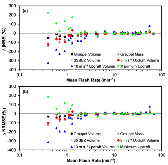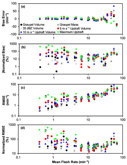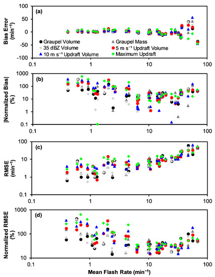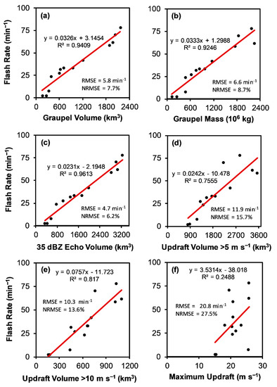 Error assessment of the regressed linear equations to predict flash rate from storm kinematic and microphysical parameters in this study utilizes calculations of the RMSE and the MBE [84] with units of min−1. The normalized RMSE (NRMSE) and normalized MBE (NMBE) in percent (%) are also calculated. For direct comparison with a recent study [48], the NRMSE (NMBE) is defined as the RMSE (MBE) divided by the range of flash rates (i.e., maximum–minimum) in the sample being assessed. Normalizing error by the range is a standard statistical practice [85] and helps to account for the wide range of flash rates in the overall and individual storm samples. Note that in Section 3.2, the normalization is by the range of flash rate in the overall data set, including all 33 storms. In Section 3.3, the error of using relationships derived from the overall data set when applied to individual storms is being assessed as a function of storm average flash rate. In this case, the normalization in Section 3.3 is by the range of flash rate in individual storms, which varies. These individual storm errors provide insight into the likely lower bound of expected error when the relationships from this study are applied to other individual storms with similar flash rates. These errors are likely a lower bound as other factors such as regional variability of storm parameters and lightning behavior, radar estimation error, and model conceptual error may influence the outcomes of these relationships when applied to other situations, as discussed in Section 4.