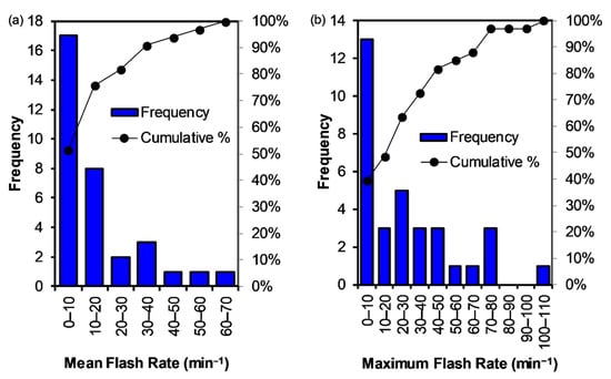 Frequency and cumulative (%) histograms of storm (a) mean and (b) maximum flash rate (min−1) for all 33 storms in this study (Table 1).