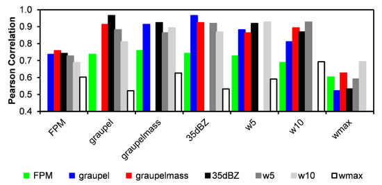 Pearson correlation coefficients between the time series of storm parameters shown in Figure 2 for a severe storm on 12 March 2010, including lightning flash rate (FPM, min−1) graupel volume (graupel, km3), graupel mass (106 kg), 35 dBZ echo volume (km3), convective updraft volume >5 m s−1 (w5, km3), convective updraft volume >10 m s−1 (w10, km3), and maximum updraft (m s−1).