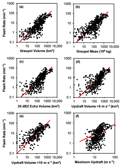 All of the flash rate parameterization relations derived from Colorado thunderstorms only [48] overestimate flash rates when applied to the Alabama thunderstorms observed in this study. As can be seen in Table 3 and Figure 8, the positive bias (NMBE) and associated scatter error (RMSE) for the Colorado-only relations [48] increase from graupel volume (NMBE = 4% and NRMSE = 16%) to 35 dBZ echo volume (NMBE = 11% and NRMSE = 27%) to graupel mass (NMBE = 14% and NRMSE = 34%) to updraft volume > 5 m s−1 (NMBE = 28% and NRMSE = 55%).