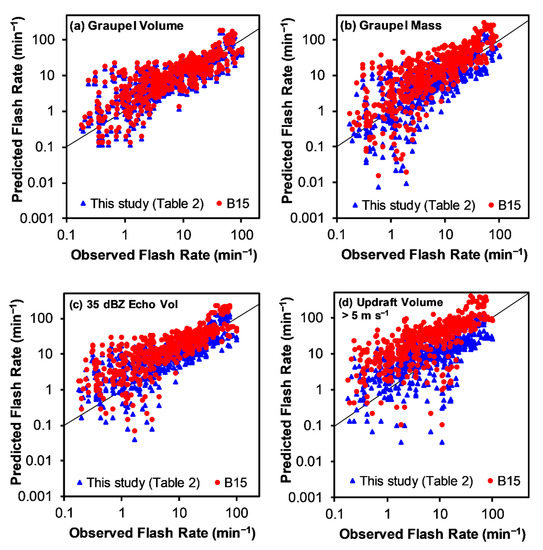 Same as Figure 7 except flash rate parameterization equations derived in a recent study using lightning and radar data from Colorado thunderstorms [48] are also applied to the Alabama data in this study and plotted with red circles (B15) alongside the same results from this study using relations in Table 2 (blue triangles). Note that only (a) graupel volume (km3), (b) graupel mass (106 kg), (c) 35 dBZ echo volume (km3), and (d) updraft volume > 5 m s−1 (km3) are shown here. The other two parameters are shown in Figure 9 in order to highlight aspects not possible in a log plot.