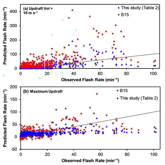 Similarly, the flash rate parameterization equations derived in earlier studies of Alabama-only or Alabama and Colorado storms combined [13,14] also have negative y-intercepts and frequently produce physically unrealistic negative flash rates when applied to the Alabama thunderstorms in this study. In fact, negative flash rates are estimated in 49% to 50% of the samples when the updraft volume > 5 m s−1 relation from the earlier study [14] is applied to the radar samples in this study (Table 4). Negative flash rates are even more frequently predicted (66–90%) when the graupel (or precipitation ice) mass relations are applied to the radar data in this study (Table 4). When negative flash rates are included in error estimation (Table 3), the bias errors for relations based on updraft volume > 5 m s−1 and graupel mass from the earlier studies [13,14] as applied to radar data in this study are negative and accompanied by large RMSE, making them generally unsuitable. Similar results and conclusions regarding frequently predicted negative flash rates were also found by a recent study [48] that tested these earlier relations [13,14] on Colorado-only data. If the negative flash rates are replaced by zero before error estimation (Table 4), the bias errors for relations in the earlier studies [13,14] become less negative for graupel mass and even slightly positive for updraft volume > 5 m s−1 when applied to radar samples in this study. The switch in bias from negative to positive when substituting zero for unphysical negative flash rates is related, in part, to the earlier updraft volume > 5 m s−1 relation [14] over-estimating flash rate at moderate-to-large values of updraft volume, as seen in a comparison (Figure 10) of the flash rate parameterization equation for Alabama storms in [14] to those derived from the Alabama data in this study (Table 2).