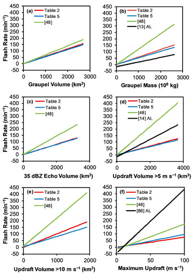 Flash rate parameterization equations based on radar-inferred microphysical or kinematic properties, including (a) graupel volume (km3), (b) graupel mass (106 kg), (c) 35 dBZ echo volume (km3), (d) updraft volume > 5 m s−1 (km3), (e) updraft volume > 10 m s−1 (km3), and (f) maximum updraft velocity (km3). Linear flash rate parameterization equations are shown for the Alabama storms in this study derived with a zero y-intercept (Table 2, red lines) and a non-zero y-intercept (Table 5, blue lines), the recent study using Colorado-only storms [48] (green lines) and the Alabama (AL) only storm relations from an earlier series of related studies [13,14,86] (black line).