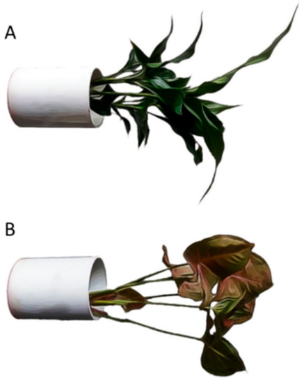 The replicate biofilters used in this experiment. (A) A replicate biofilter with Spathiphyllum wallisii. (B) A replicate biofilter with Syngonium podophyllum.
