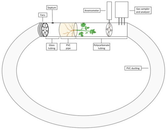 For testing, botanical biofilters were placed individually into a closed-loop flow reactor (Figure 2). In this system, air circulated through the loop and passed through the biofilter once for each completed circuit. The closed-loop flow reactor, composed of polyvinyl chloride (PVC) ducting, glass tubing, and clear polycarbonate tubing, had a 100 mm internal diameter and was 2.80 m in length with several sensors embedded throughout. Total reactor internal volume was 0.9 m3. Two axial impellers (FANTECH TEF-100 fan 16 W) were ducted in series into the flow reactor to provide active airflow. The fans were connected to a potentiometer to enable modifications to fan power, ensuring each trial was conducted at the same airflow rate. Airflow generated by the fans passed through the biofilter substrate and then the foliage, after which the airstream was exposed to several sensors before return to the axial impellers and thus recirculated through the flow reactor. Pressure drop across the botanical biofilters within the closed loop flow reactor was measured with a Sensirion digital sensor (SDP610 125 Pa) and the average pressure drop was 83.2 and 84.3 Pa for S. wallisii and S. podophyllum, respectively. An anemometer (Digitech Thermo-anemometer QM1646) was embedded on the downstream side of the biofilter to measure the air velocity flowing through the biofilter, from which the volumetric airflow rate could be determined. Instruments for measuring the concentrations of NO, NO2 (Ecotech EC9841 nitrogen oxides analyser), and O3 (Ecotech Serinus 10 ozone analyser) were ducted into the biofilter’s leeward side within the flow reactor with Teflon tubing.