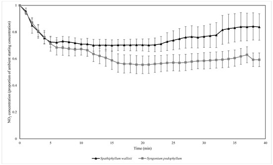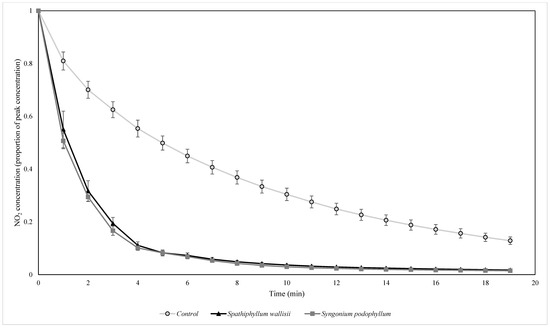Biofilters were first trialled for their capacity to remove ambient concentrations of NO, NO2, and O3. Six biofilters containing S. wallisii and six biofilters containing S. podophyllum were used for this experiment. Additionally, 10 trials were conducted without any biofilter in the flow reactor to represent a procedural control to account for any effects resulting from loss by diffusion, chemical reactions, and adsorption to the flow reactor surfaces. Species and control treatments were conducted in a randomised order. Trials were run for 40 min, which was sufficient time for the concentration of NO2 to reach an asymptote across both biofilter treatments. The average ambient concentrations of pollutants detected within the flow reactor for the procedural control were 46.39 ± 0.006 ppbv for NO, 70.08 ± 0.017 ppbv for NO2, and 0.486 ± 0.004 ppbv for O3 (Figure S1).