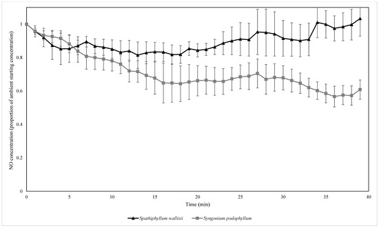 The biofiltration of elevated concentrations of NO by biofilters containing two different plant species at indoor light levels. NO concentrations were normalised by the starting ambient concentration of NO. n = 4 independent samples per treatment, error bars represent the SEM.