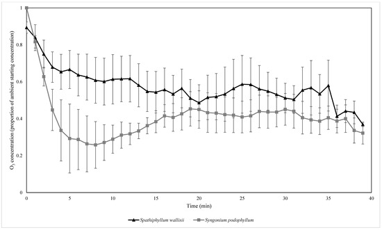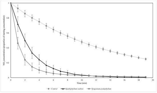 For this experiment, six biofilters containing S. wallisii and six biofilters containing S. podophyllum were tested. Additionally, 10 trials were conducted without any biofilter in the flow reactor as a procedural control to account for any effects resulting from diffusion, reaction, or adsorption to the flow reactor surfaces, as per experiment 1. All trials were conducted in a randomised order. Trials were run for 20 min, which was sufficient time for the concentration of NO2 to reach an asymptote across both biofilter treatments.