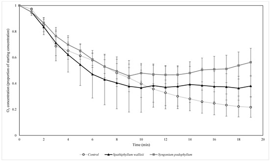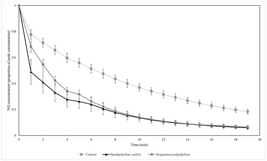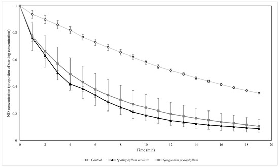 There were significant differences in the NO exponential decay rates between both light type (F = 15.760, p = 0.000) and biofilter treatment (F = 26.939, p = 0.000), however, there was no significant interaction between the two factors for the NO decay rates (F = 1.214, p = 0.312). Subsequent Tukey HSD post hoc tests showed that the control treatment lost NO at a significantly slower rate than both of the biofilter treatments (p = 0.000 for both comparisons), while the biofilters containing S. wallisii and S. podophyllum did not have significantly different NO decay rates (p = 0.104).