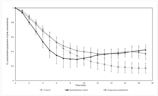 A two factor ANOVA comparing O3 decay rates amongst the groups showed that the O3 decay rate differed significantly amongst the biofilter types (F = 10.406, p = 0.000) with post hoc Tukey tests showing the control treatment removed O3 at a significantly faster rate than the S. wallisii and S. podophyllum biofilters (p = 0.001 and 0.000 for the respective comparisons).