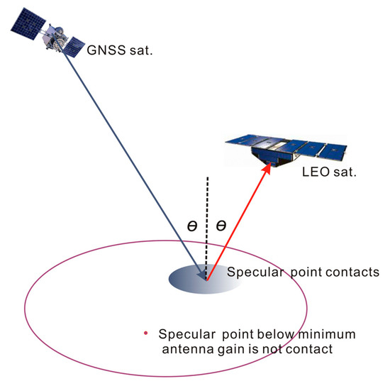 Following Gao [15], the multi-GNSS signals from GPS, GLONASS, Galileo, and BDS were used as the signal sources for GNSS-R observations in the present simulation. What needs to be mentioned is that the four full operational GNSS constellations were all simulated based on their nominal constellation configurations presented in [24,25,26,27], considering that Galileo and BDS have not yet reached their full planned constellations until now, and the third generation of BDS was used. In the simulation, four steps were followed to determine the available reflected GNSS signals: (1) For each LEO satellite, the potentially available GNSS satellites for reflection observations were selected; (2) The positions of the specular reflection points could be calculated after the positions of the LEO and the GNSS satellites were determined; (3) As shown in Figure 1, only the specular points located within the minimum antenna gain could be contacted; and (4) Furthermore, only the locations of the specular points with 10 highest range corrected gain (RCG) were considered (see the detail of RCG in [16]). In addition, it should be mentioned that the LEO satellites were 3-axis stabilized and the antenna beam widths of the LEO satellites simulated in the present study were the same as that of the TDS-1 satellite, considering that the definitive beam widths of the CYGNSS mission have not been given [15].