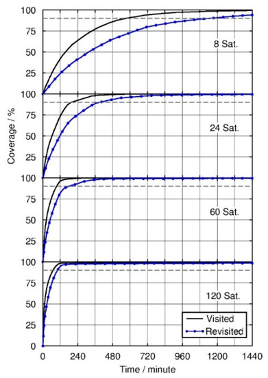 The visited and the revisited coverages obtained by the optimal 8-, 24-, 60- and 120-satellite 2D-LFCs during one day are shown in Figure 2. As stated in Section 2.2, the length of the time for 90% visited coverage defines the fitness function in this study. The revisit coverage means the percentage of all the 1° × 1° cells that have been visited twice, and the temporal resolution of GNSS-R observations are usually evaluated by the length of the time corresponding to certain revisit coverage.