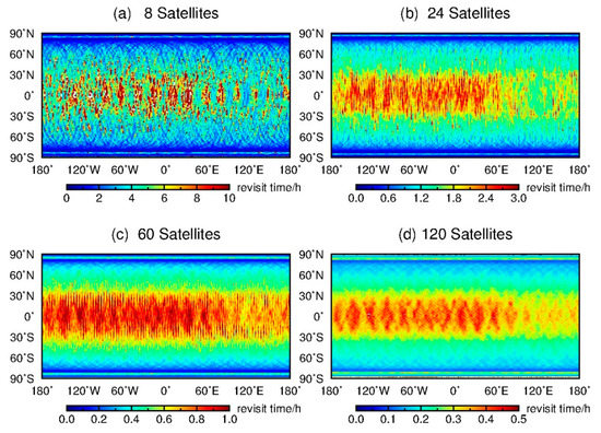 The spatial distribution of the mean revisit time for the 1° × 1° grid cells of the optimal (a) 8-, (b) 24-, (c) 60-, and (d) 120-satellite 2D-LFCs, respectively, during one day.