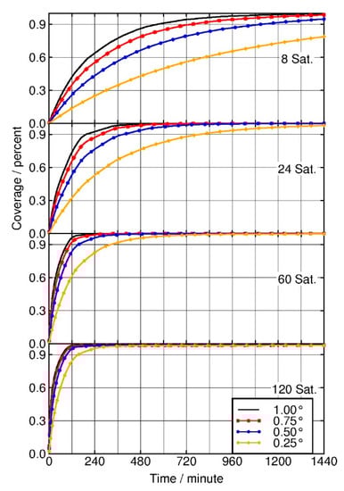 Figure 5 presents the coverage as a function of time during one day for different cell sizes (i.e., 1° × 1°, 0.75° × 0.75°, 0. 50° × 0.50°, and 0.25° × 0. 25°), obtained by the optimal 8-, 24-, 60-, and 120-satellite 2D-LFCs, respectively. It can be seen that for certain optimal constellations, the smaller the cell size, the longer the time for reaching the 90% coverage goal, which is consistent with [16]. While even with the smallest cell size, 0.25° × 0. 25°, the 90% coverage goal could be reached during one day for all the optimal 2D-LFCs, except for the 8-satellite one.